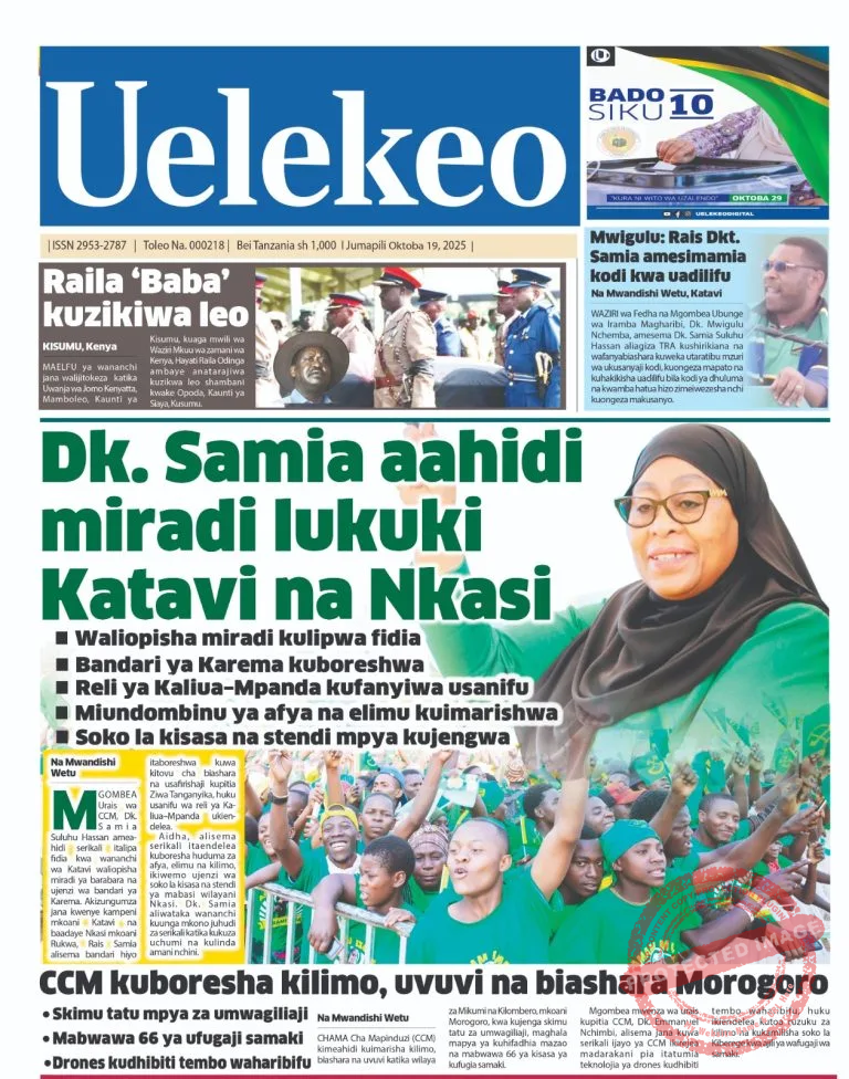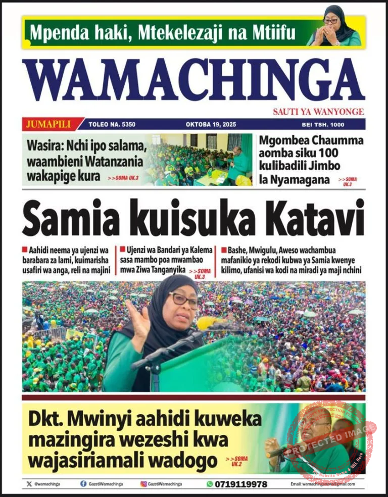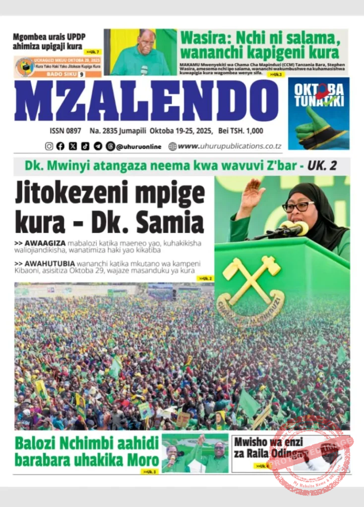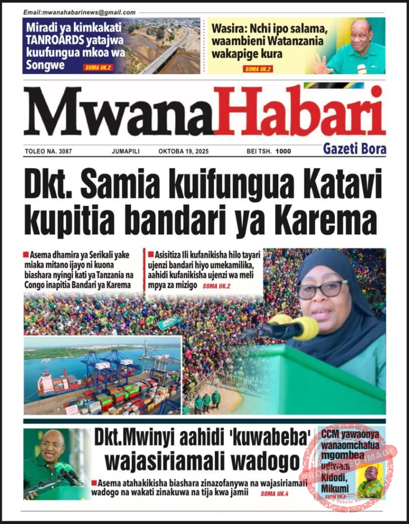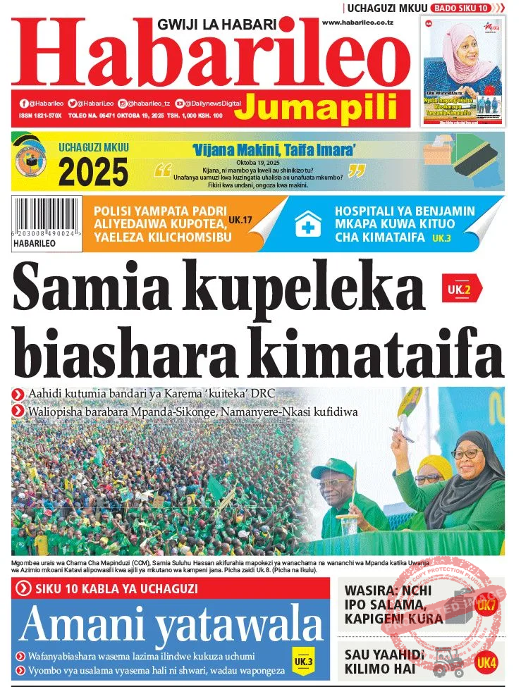 Hizi ni kurasa za mbele za magazeti ya leo, Jumapili tarehe 19 Oktoba 2025, zenye kuangazia habari kuu za kitaifa na kimataifa. Kupitia vichwa vya habari vya magazeti mbalimbali, wasomaji wanapata muhtasari wa matukio makubwa yanayoendelea nchini, yakiwemo masuala ya siasa, uchumi, michezo, na matukio ya kijamii yanayogusa maisha ya Watanzania.