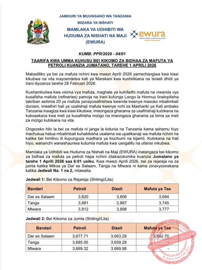 Bei ya mafuta ya petroli imepanda kwa kiwango kikubwa, ambapo katika Jiji la Dar es Salaam imeongezeka kutoka shilingi 2,864 kwa lita mwezi Machi hadi kufikia shilingi 3,820 kwa lita mwezi Aprili 2026, kulingana na taarifa iliyotolewa na Mamlaka ya Udhibiti wa Huduma za Nishati na Maji (EWURA).