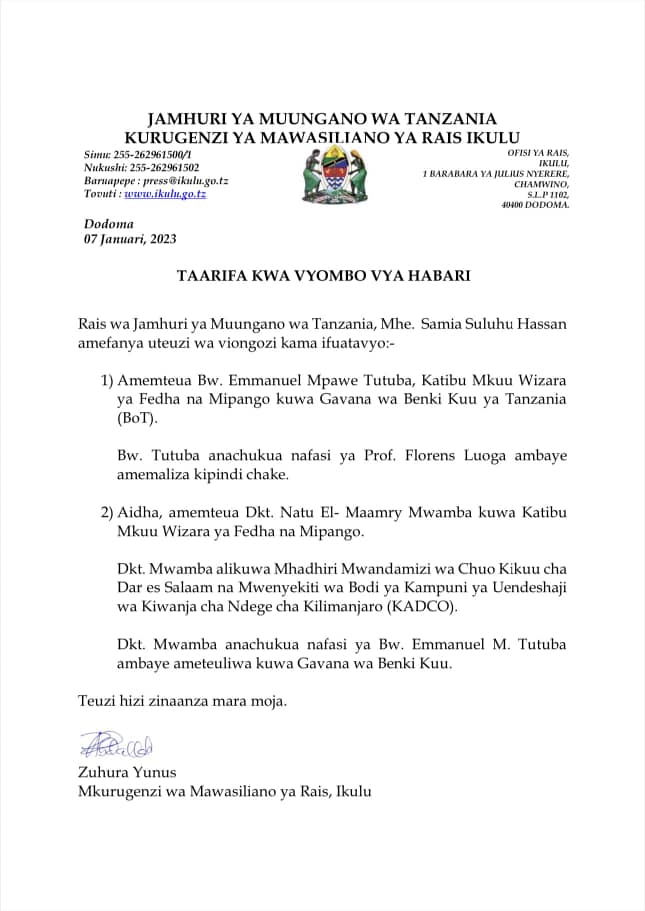 Rais wa Jamhuri ya Muungano wa Tanzania, Dkt. Samia Suluhu Hassan amemteua Emmanuel Mpawe Tutuba, Katibu Mkuu Wizara ya Fedha na Mipango kuwa Gavana wa Benki Kuu ya Tanzania (BoT) akichukua nafasi ya Prof. Florens Luoga ambaye amemaliza kipindi chake.