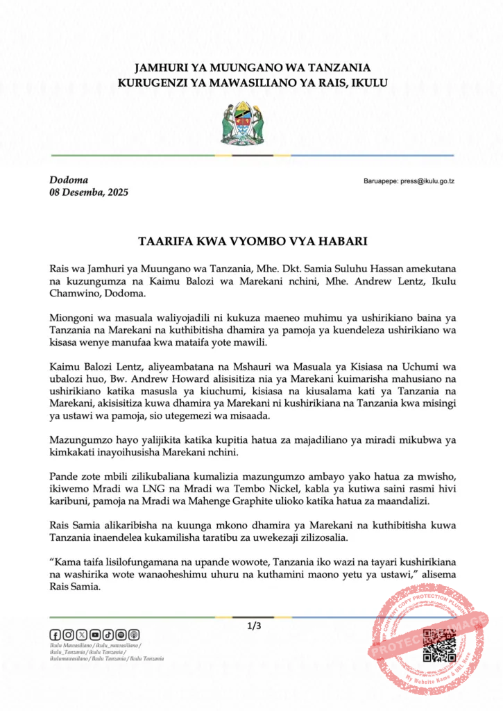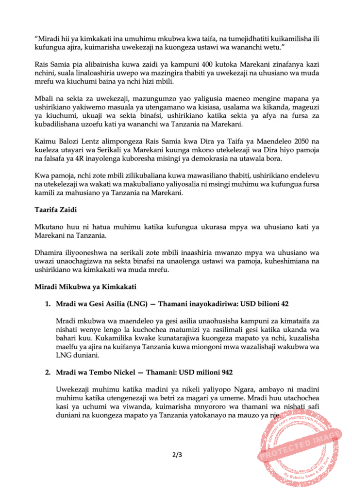 Marekani imeonyesha dhamira ya kukuza mahusiano ya kiuchumi yanayolenga manufaa ya pamoja, huku Rais Samia akiahidi kuharakisha taratibu za utekelezaji wa miradi hiyo. Taarifa hiyo imebainisha pia kuwa zaidi ya kampuni 400 za Marekani zinafanya shughuli za kibiashara nchini, ishara ya kuimarika kwa mazingira ya uwekezaji.