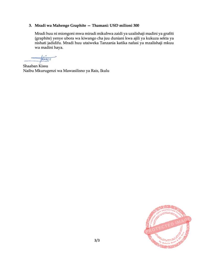 Kwa mujibu wa taarifa iliyotolewa na Naibu Mkurugenzi wa Mawasiliano ya Rais – Ikulu, Shaaban Kissu, imeeleza kuwa mazungumzo hayo yapo katika hatua za mwisho za makubaliano ya miradi ya kimkakati ikiwemo LNG na Tembo Nickel, huku uchambuzi wa kiufundi wa Mradi wa Mahenge Graphite ukiendelea.