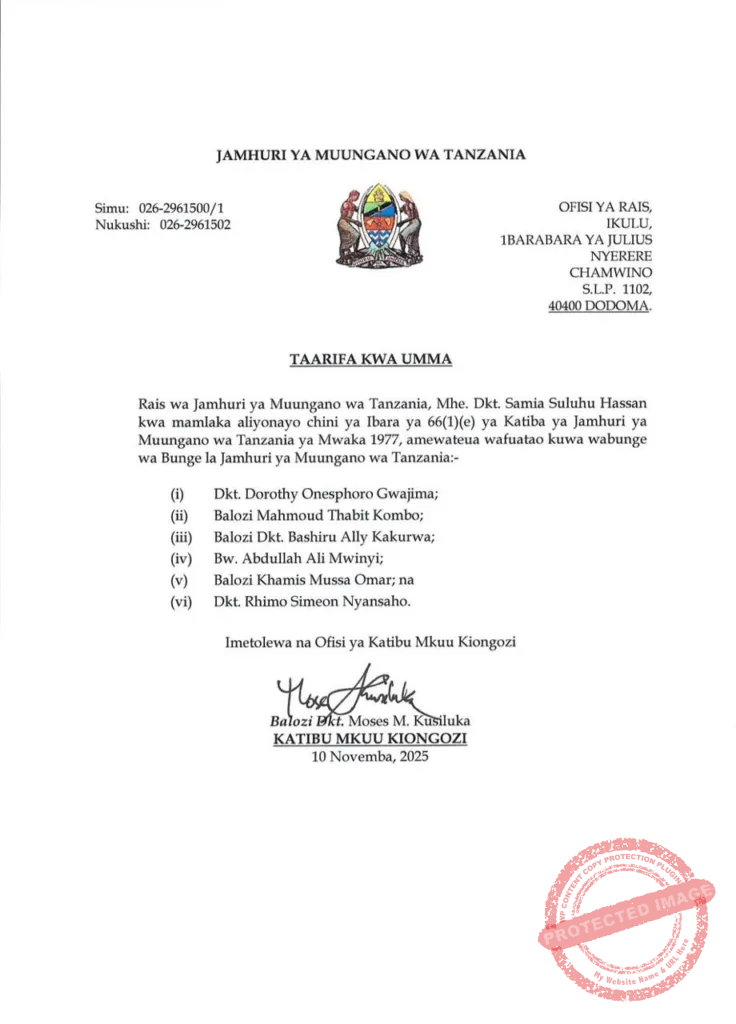 Taarifa hii imetolewa na Ofisi ya Katibu Mkuu Kiongozi, ikisainiwa na Balozi Dkt. Moses M. Kusiluka, Katibu Mkuu Kiongozi, tarehe 10 Novemba 2025.